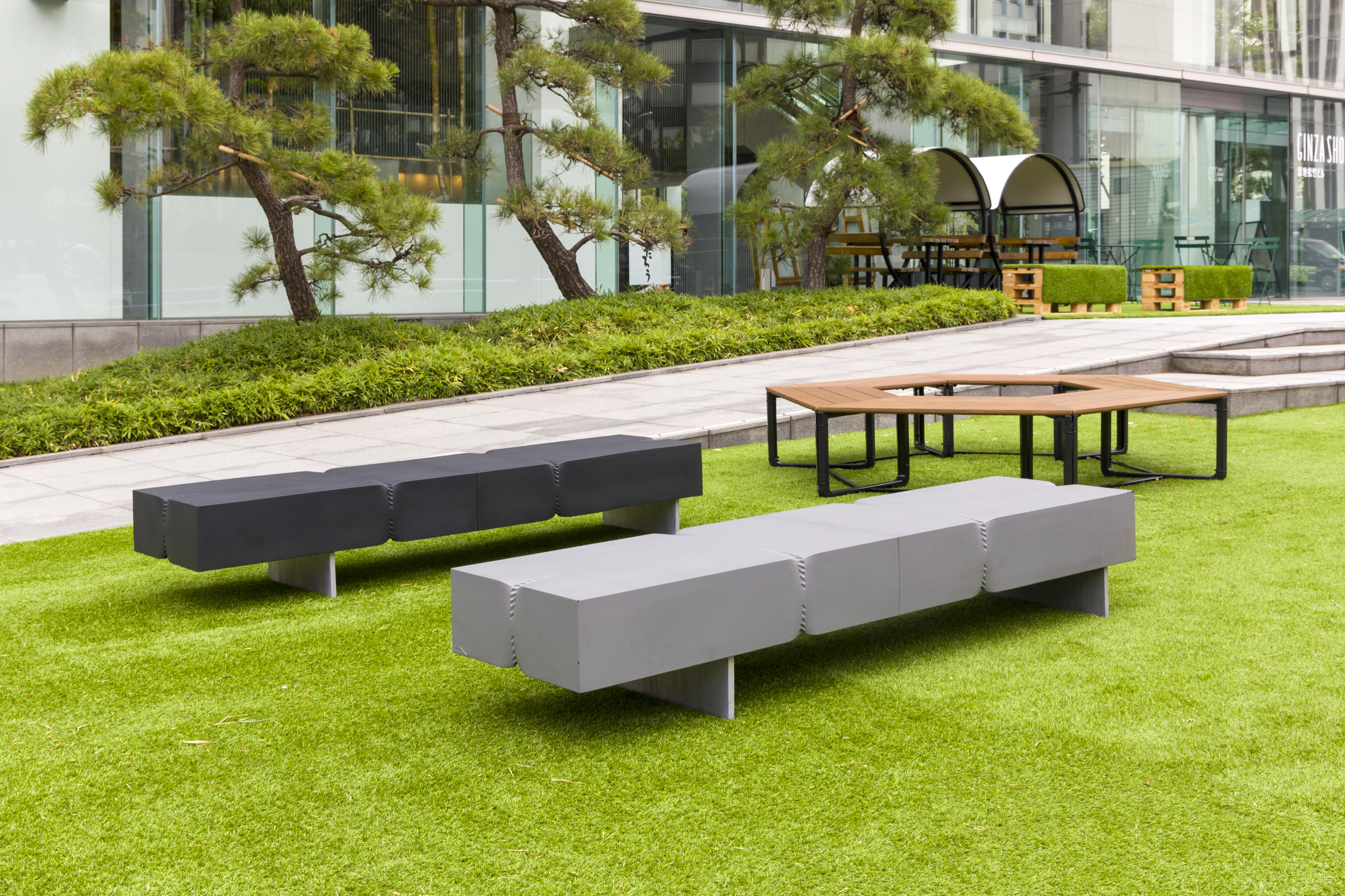 スタイリッシュな空間に広がる芝生の上には、都会的な雰囲気に馴染みながら独特の存在感を放つ「LAVA bench」と、天然木のぬくもりを感じる「COMM」を設置。芝生の緑と調和しながら、それぞれが異なる魅力を放っています。