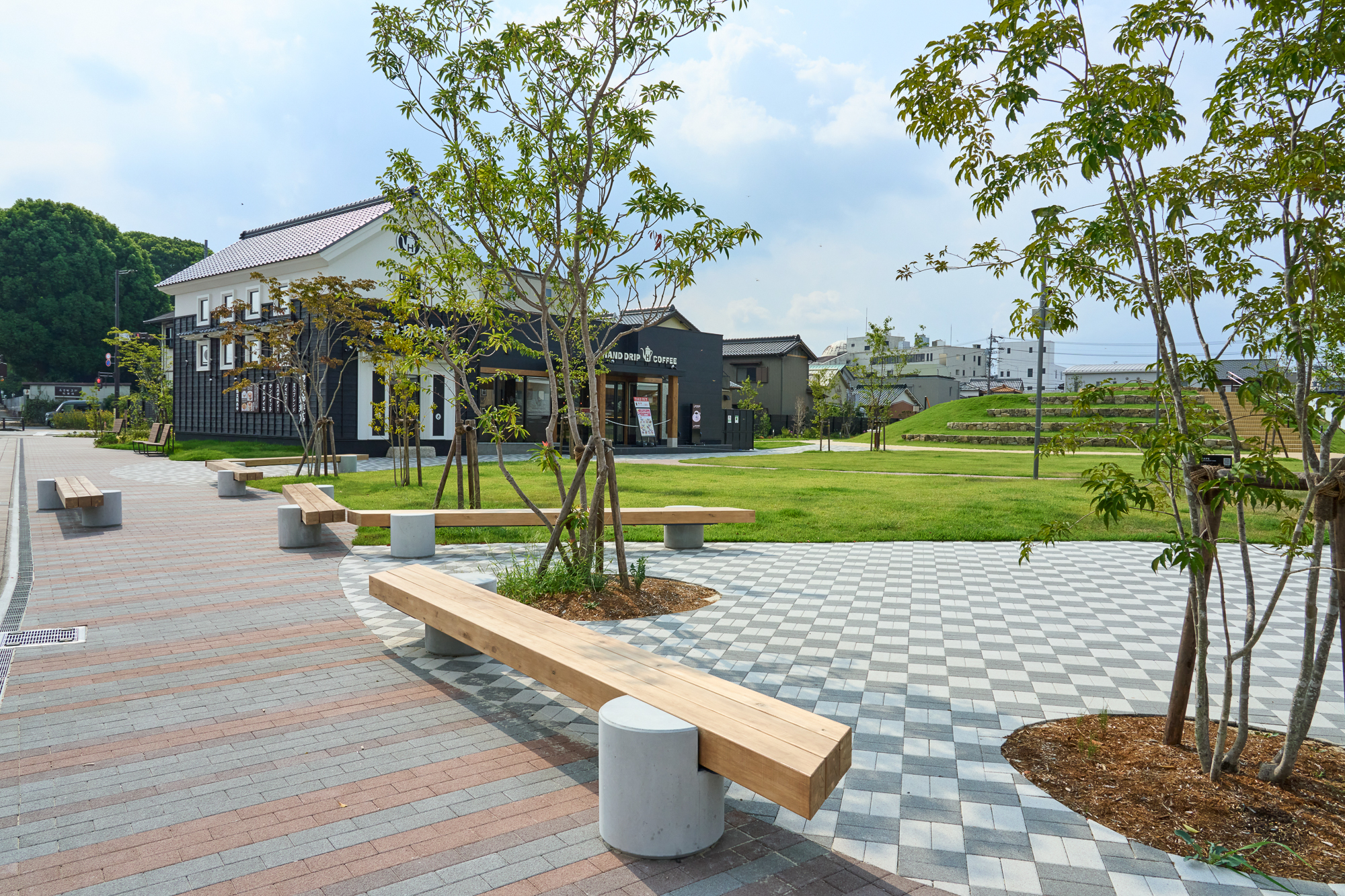 旧中央図書館跡地という立地を生かし、「歴史を感じ、くつろぎとにぎわいが共存する新たなみんなの居場所」というコンセプトのもとに整備された公園です。