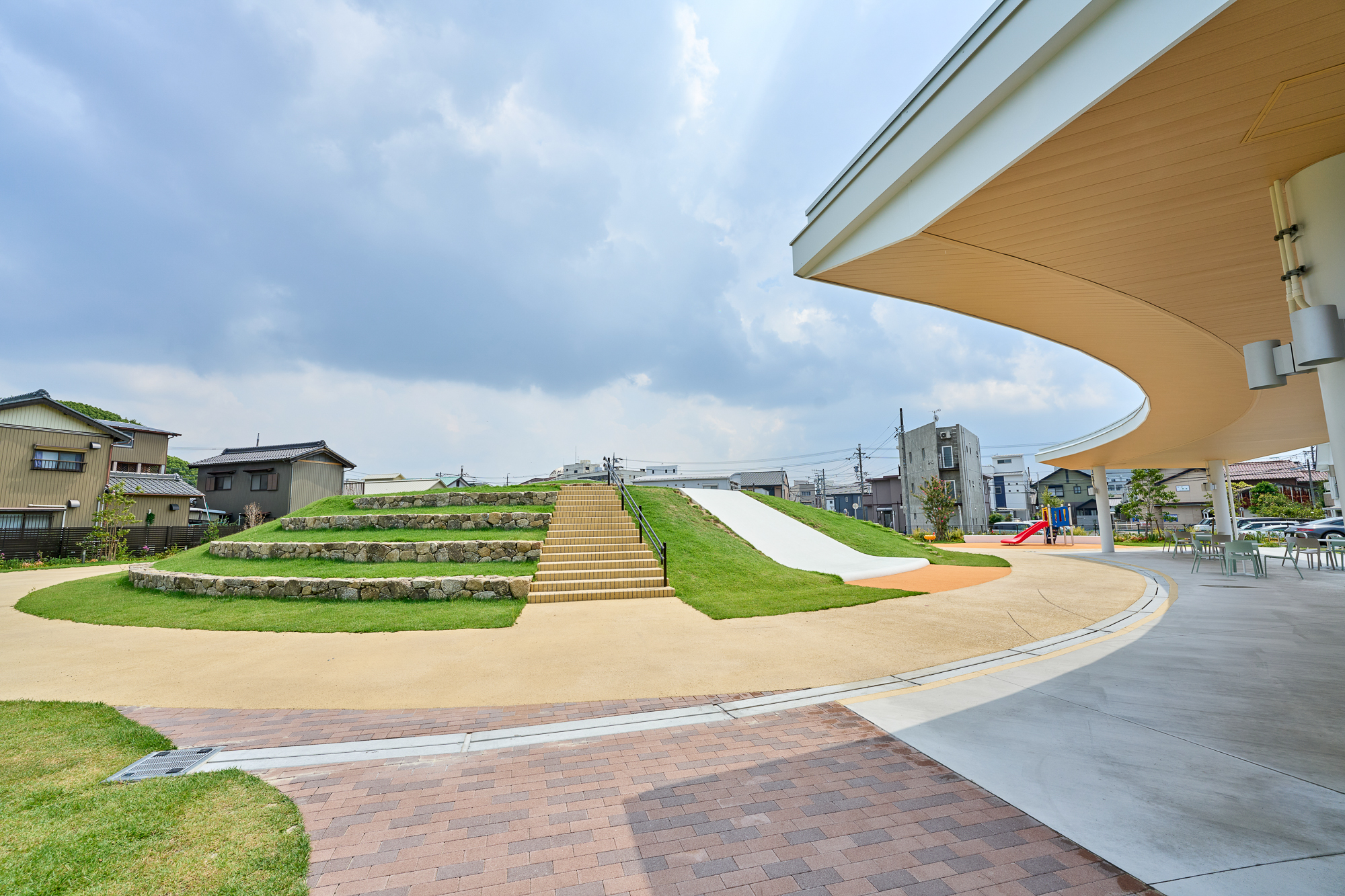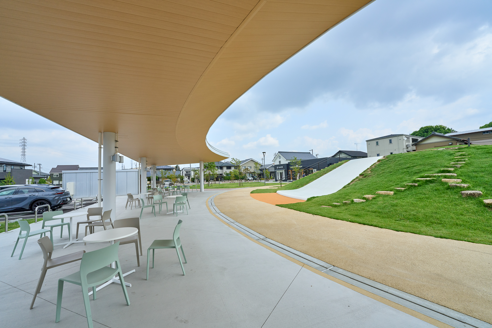 設計の際、spaceさんが屋根の形を『ここまき山』に沿わせてデザインしてくださったので、大きな屋根でありながら公園全体の雰囲気にも自然に馴染んでいると思います。