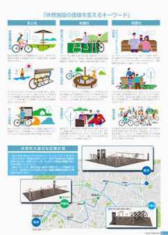 デザインを統一したバイクラックとテーブル付のコンパクトなファニチャーを組み合わせることで、 飲食等のアクティビティとともにコミュニケーションが生まれる高品質な休憩スポットを最小限のスペースで作ることが出来ます。 拡張性があるので小拠点から大拠点まで対応が可能です。